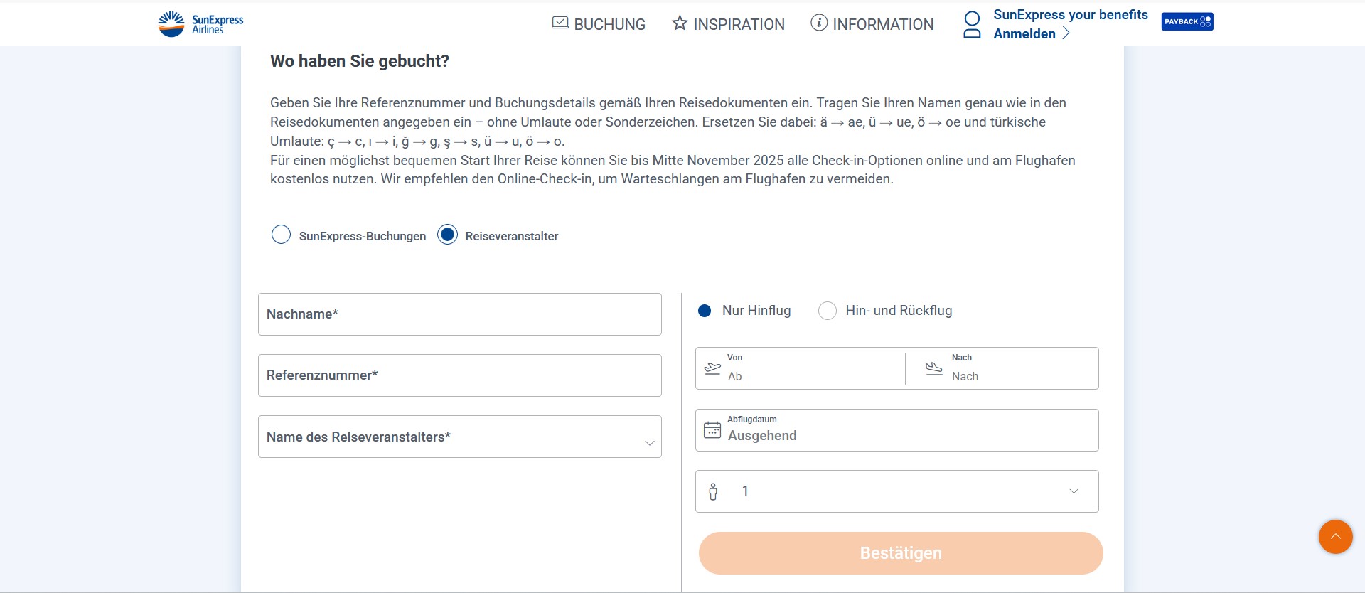 anschließend auf Reiseveranstalter und die Referenznummer ist die Buchungsnummer vom Reiseveranstalter, danach deine ganzen Daten, von, nach, Datum vom Flug usw...