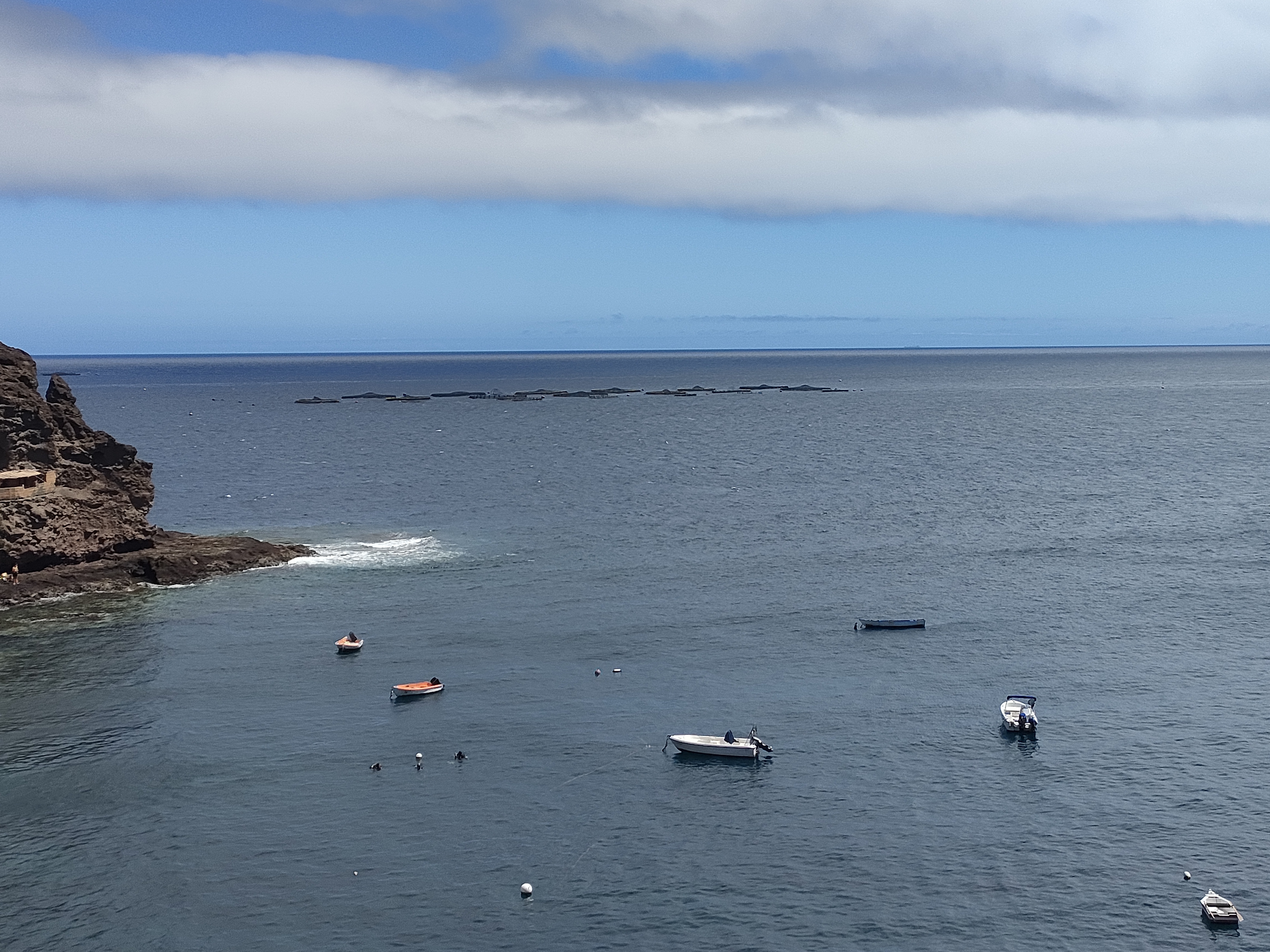 Am Horizont ist ein Container Schiff, da ist ein Seeweg. Vorne tauchen welche, weiter hinten scheint eine Fischfarm oder so etwas zu sein. Das Schiff fährt vielleicht gen Gibraltar, dann sind wir in Südportugal, bei Sagres grob. Ich bitte um deine Meinung dazu.