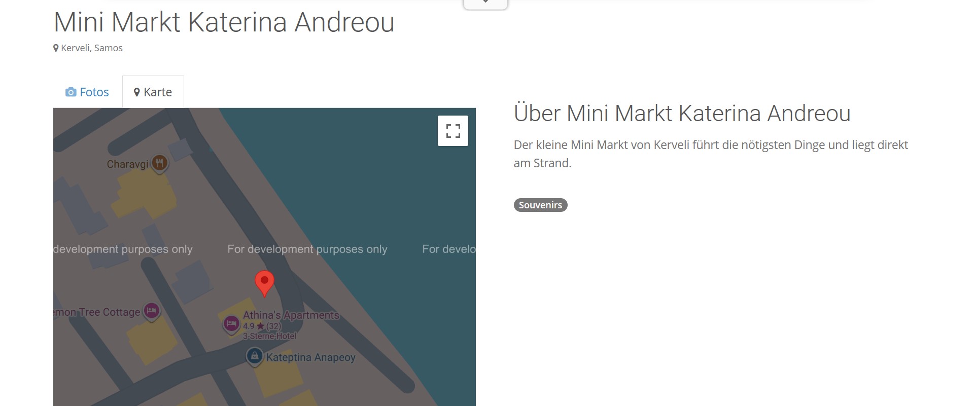 "Kerveli, ein ruhiger Küstenort auf Samos, bietet nur sehr begrenzte Einkaufsmöglichkeiten direkt im Ort, hauptsächlich kleine Minimärkte für den Grundbedarf." - hier zu lesen