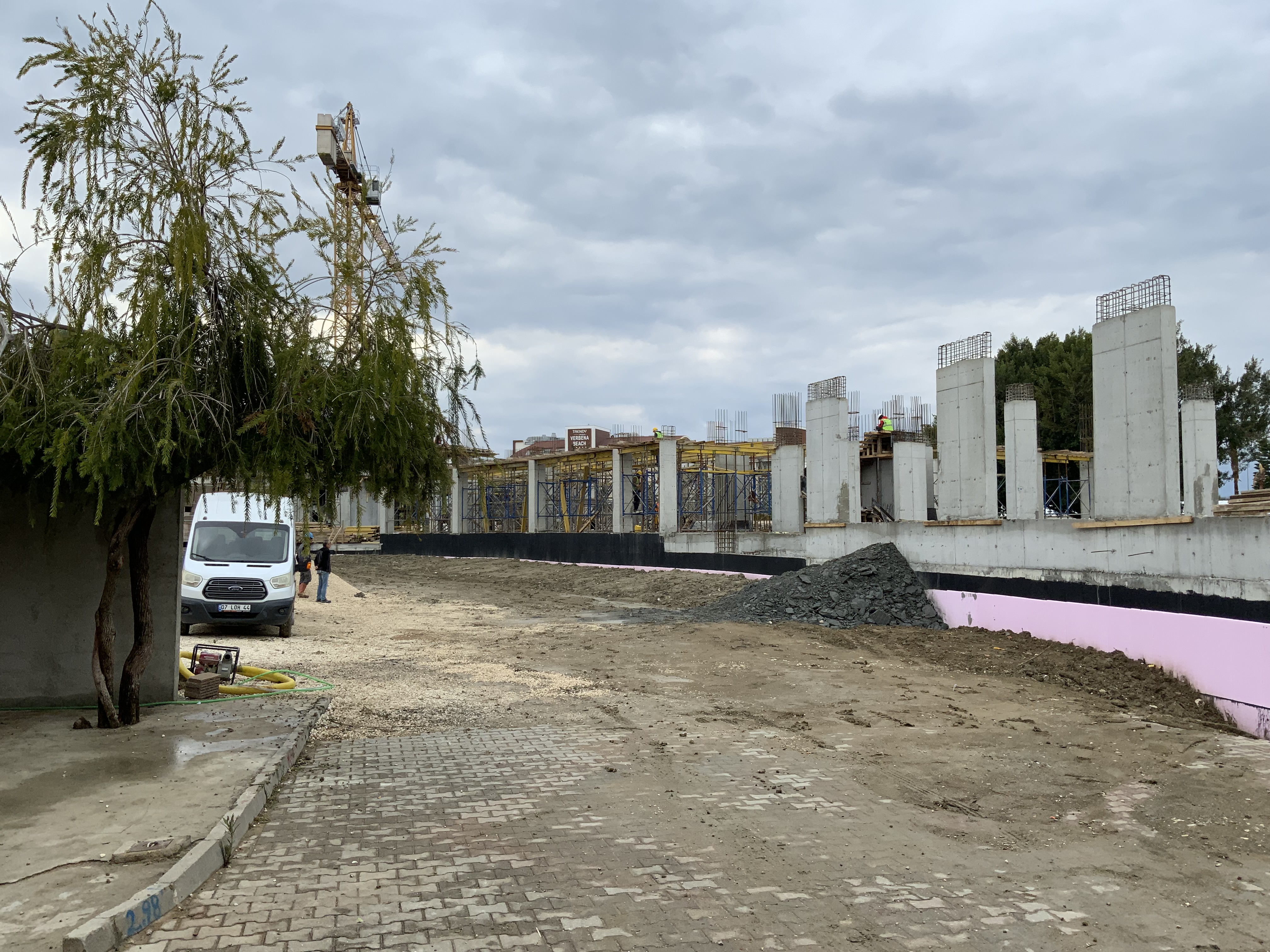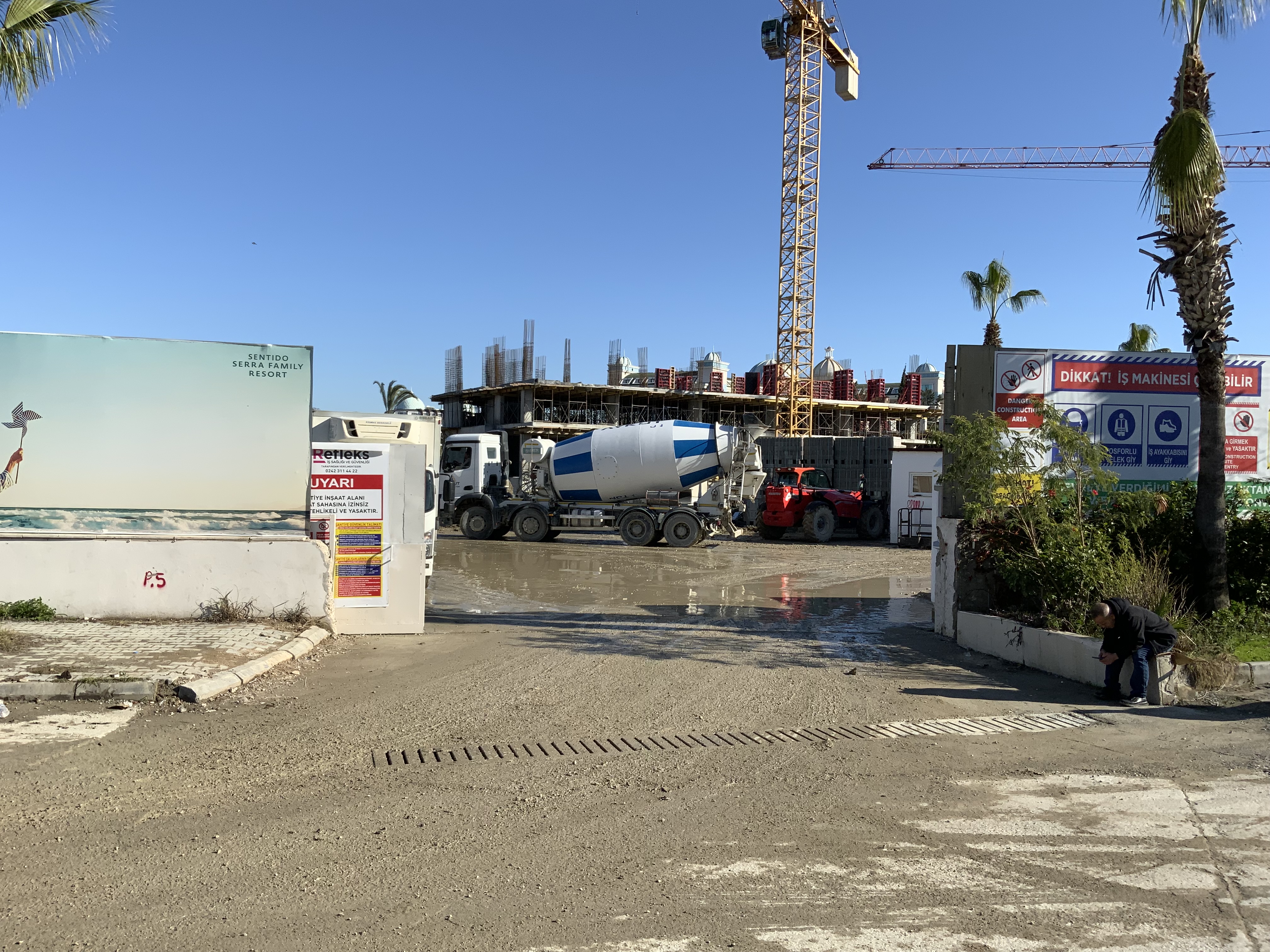 eine Zufahrt zur Baustelle gegenüber vom HaneGarden Nebengebäude, auch nur das Fundament zu sehen…noch viel zu tun, auf der Zufahrtsstraße zum Trendy Linienverkehr der Betonmischer LKW..