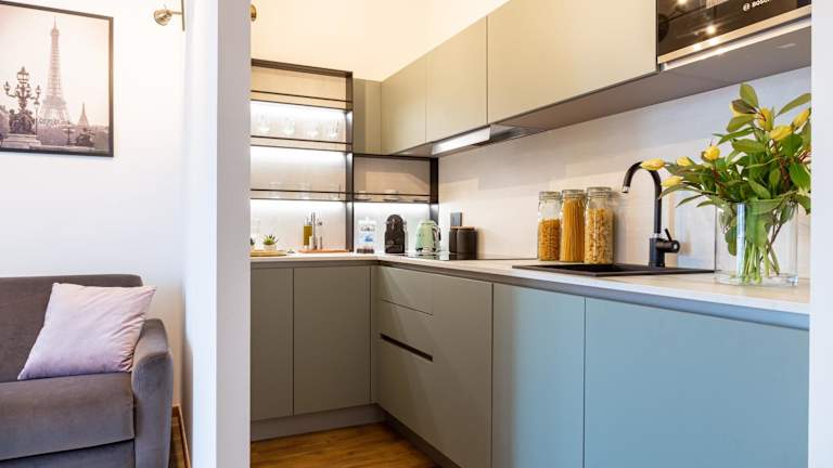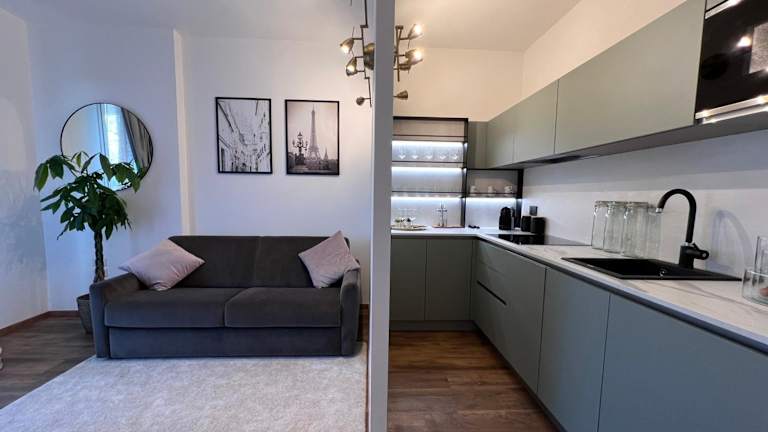 Das Apartment besteht aus einem Schlafzimmer, einem Wohnzimmer, einer voll ausgestatteten Küche mit Kühlschrank und Kaffeemaschine sowie einem Badezimmer mit Bidet und Dusche. Handtücher und Bettwäsche werden bereitgestellt.