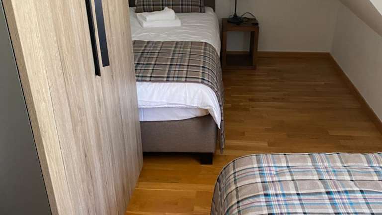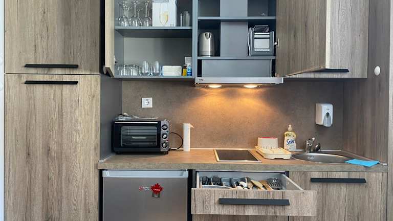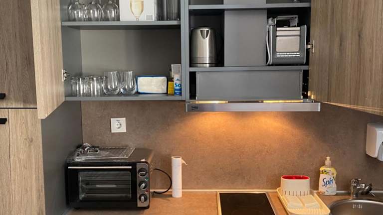 Die Ferienwohnung verfügt über ein Schlafzimmer und ein Wohnzimmer, das mit einem Flachbild-TV mit Kabelkanälen ausgestattet ist. Es gibt eine voll ausgestattete Küche mit Kühlschrank und Ofen sowie ein Badezimmer mit Dusche. Handtücher und Bettwäsche werden bereitgestellt.