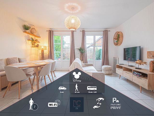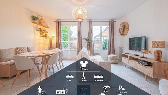 Die Unterkunft nennt sich *Disneyland-Paris* 7pers, Wifi, Parking und beeindruckt mit einer Terrasse sowie einer voll ausgestatteten Küche. Die Wohnung wird von einem privaten Gastgeber geleitet, und es gelten Altersbeschränkungen für den Check-in und die Gäste. Haustiere sind nicht gestattet, und Feierlichkeiten wie Junggesellenabschiede sind nicht erlaubt.