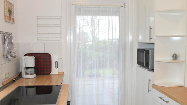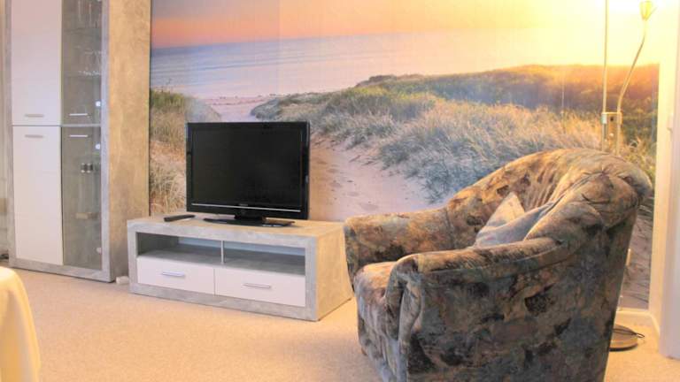 Die Ferienwohnung umfasst ein Schlafzimmer, ein Wohnzimmer und eine gut ausgestattete Küche, die mit einem Kühlschrank und einem Geschirrspüler ausgestattet ist.