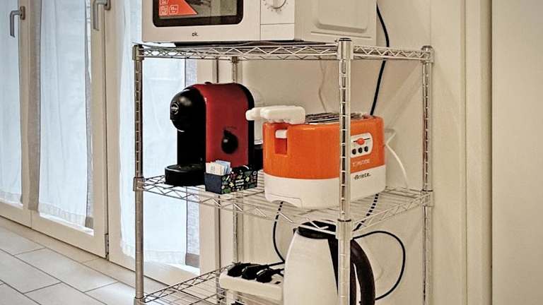 Die Ferienwohnung verfügt über eine voll ausgestattete Küche mit Kühlschrank und Kaffeemaschine, die für die Zubereitung eigener Mahlzeiten genutzt werden kann.