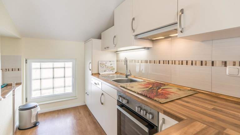 Die Unterkunft umfasst eine Küche, ausgestattet mit einem Kühlschrank und einem Geschirrspüler.