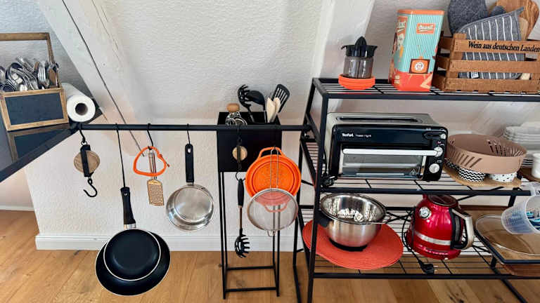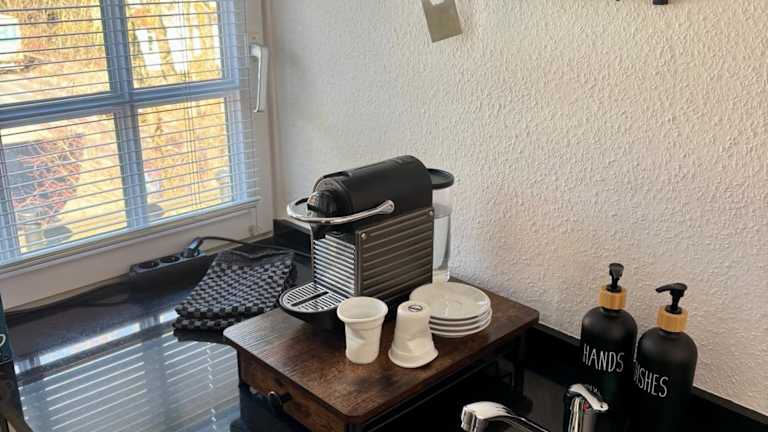 Die Ferienwohnung verfügt über eine voll ausgestattete Küchenzeile mit Kühlschrank und Kaffeemaschine, die den Gästen die Möglichkeit zur Selbstversorgung bietet.