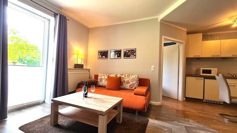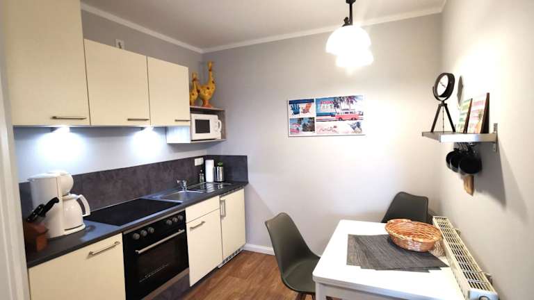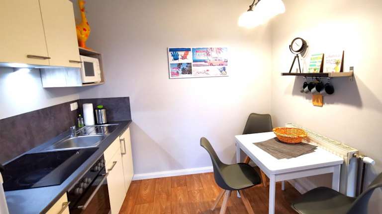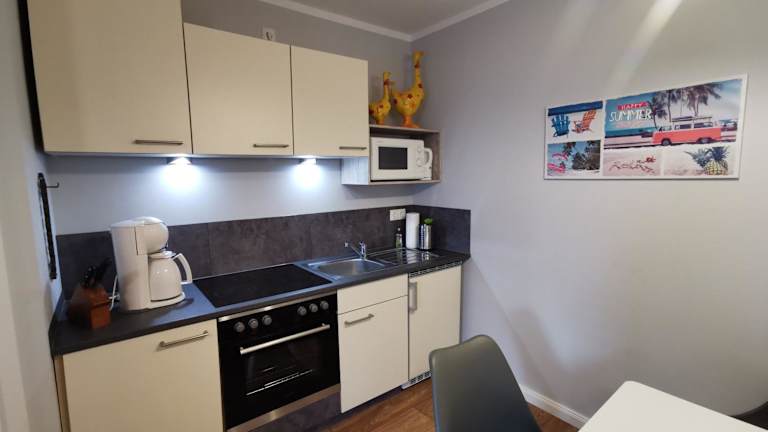 Die Ferienwohnung bietet ein Schlafzimmer, eine Küche mit Kühlschrank und Ofen, einen Flachbild-TV, einen Sitzbereich und ein Badezimmer mit Dusche. Handtücher und Bettwäsche werden bereitgestellt. Es gibt Nichtraucherzimmer und Familienzimmer.