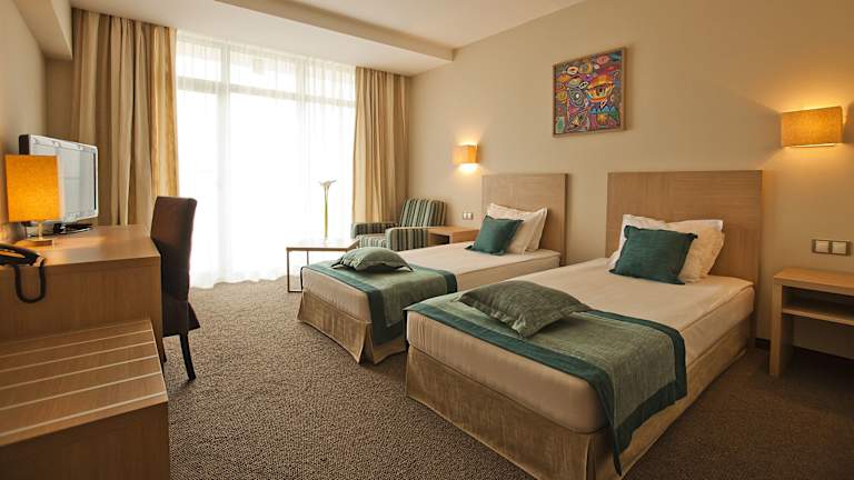 Das Azalia Beach Hotel Balneo & SPA verfügt über 235 ansprechend und modern eingerichtete Zimmer. Zur Ausstattung gehören ein Flachbildfernseher, ein Schreibtisch, WLAN (gegen Gebühr), eine Minibar (gegen Gebühr) und eine Klimaanlage. Die Zimmer bieten entweder seitlichen Meerblick oder sind für Familien geeignet.