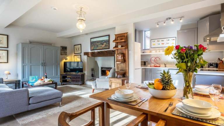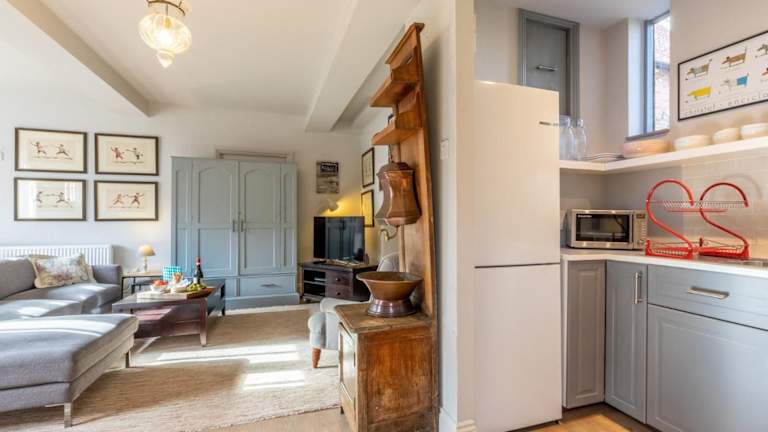 Die Ferienwohnung umfasst einen TV und eine voll ausgestattete Küche mit Kühlschrank, Geschirrspüler und Ofen.