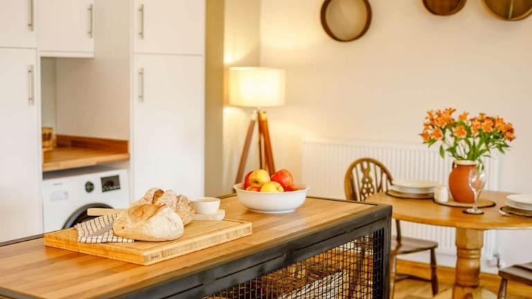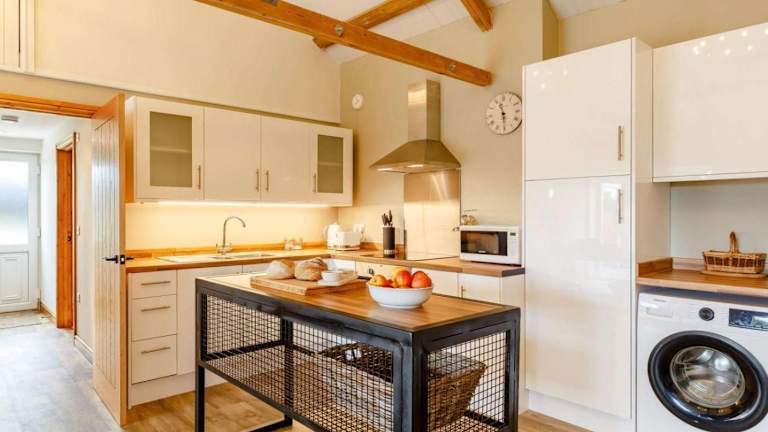 Die Unterkunft umfasst ein Schlafzimmer, eine voll ausgestattete Küche mit Kühlschrank, Geschirrspüler und Waschmaschine sowie ein Badezimmer. Handtücher und Bettwäsche werden bereitgestellt.