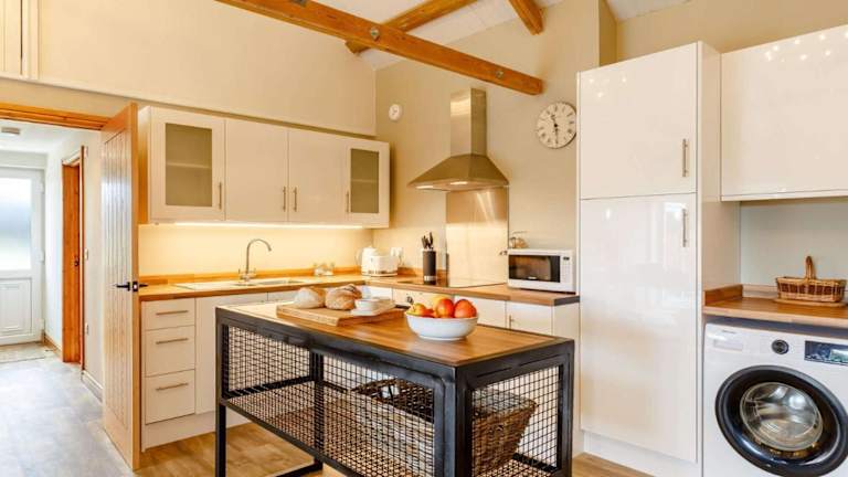 Die Unterkunft umfasst ein Schlafzimmer, eine voll ausgestattete Küche mit Kühlschrank, Geschirrspüler und Waschmaschine sowie ein Badezimmer. Handtücher und Bettwäsche werden bereitgestellt.