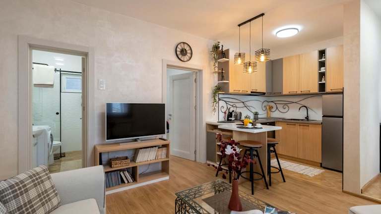 Die Wohnung verfügt über ein Schlafzimmer, ein Wohnzimmer und ein Badezimmer mit einer Dusche sowie kostenlosen Pflegeprodukten. Handtücher und Bettwäsche werden zur Verfügung gestellt.