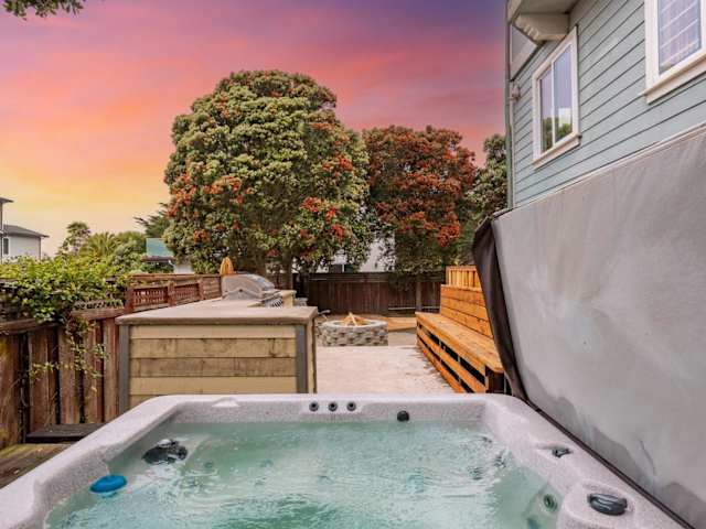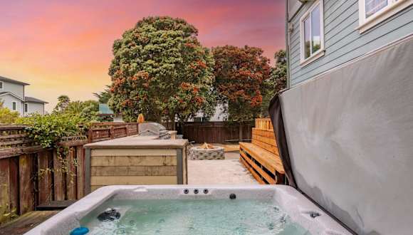 Die Unterkunft 1 block to beach, Private Hot Tub, Fire Pit and BBQ bietet einen eigenen Strandbereich, einen Garten und Grillmöglichkeiten. Sie besticht durch ihren Gartenblick, kostenloses WLAN sowie einen kostenlosen Privatparkplatz.