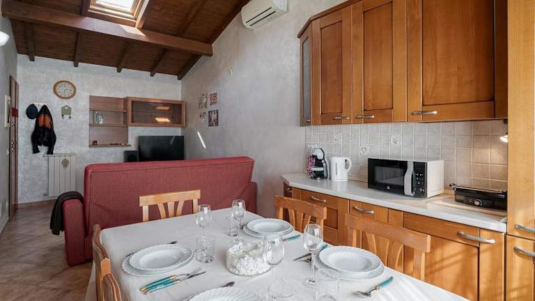 Die Ferienwohnung umfasst ein Schlafzimmer, ein Wohnzimmer sowie eine voll ausgestattete Küche, die mit einem Kühlschrank und einer Kaffeemaschine ausgestattet ist. Des Weiteren gibt es ein Badezimmer mit einem Bidet und einer Dusche. Handtücher und Bettwäsche werden bereitgestellt.
