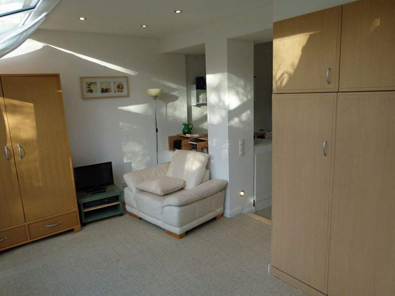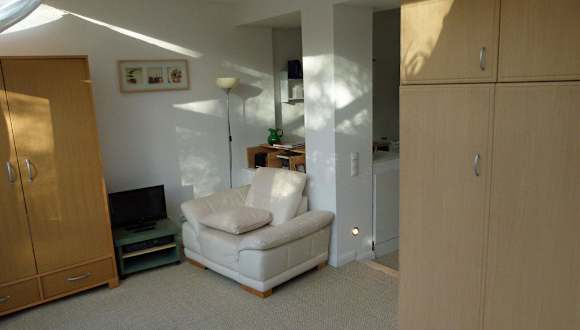 Das Apartment ist modern eingerichtet und verfügt neben einem kleinen Bad (Dusche, WC und Waschbecken), einer ausgestatteten Pantryküche, einem Bett (140x200cm), über TV, DVD-Player und Internet (WLAN). Türen und Fensterrahmen sowie Dielenfußboden sind original erhalten.