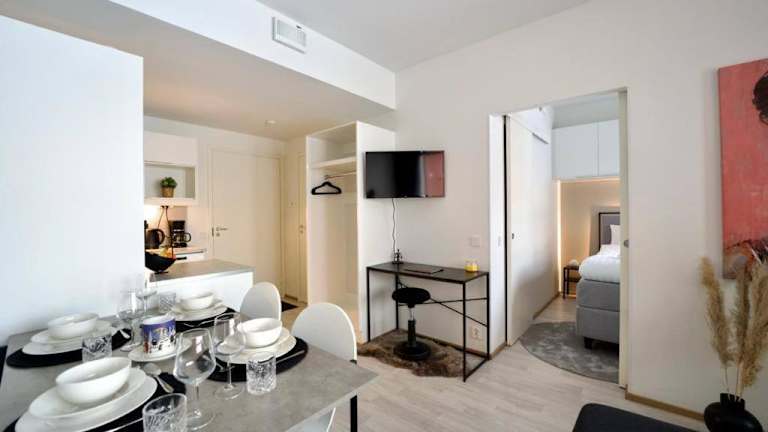 Die Ferienwohnung besteht aus einem Schlafzimmer und ist mit einer Küche ausgestattet, die über einen Kühlschrank und einen Geschirrspüler verfügt. Zudem gibt es einen Flachbild-TV, einen Sitzbereich und ein Badezimmer, das mit einem Bidet ausgestattet ist. Handtücher und Bettwäsche werden bereitgestellt.