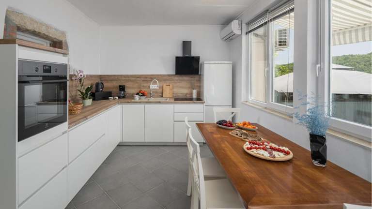 Das Ferienhaus verfügt über zwei Schlafzimmer und ist mit Klimaanlage ausgestattet. Die Küche ist mit einem Kühlschrank und einem Geschirrspüler eingerichtet.