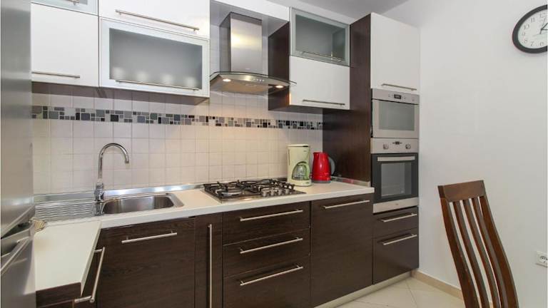 Die Ferienwohnung verfügt über eine voll ausgestattete Küche mit einem Kühlschrank und einer Kaffeemaschine, die die Zubereitung eigener Mahlzeiten ermöglicht. Es sind keine Informationen über zusätzliche Verpflegungsmöglichkeiten oder gastronomische Angebote vorhanden.