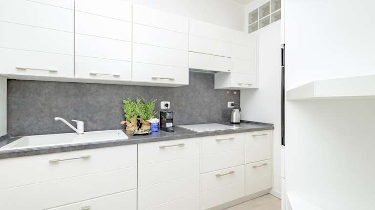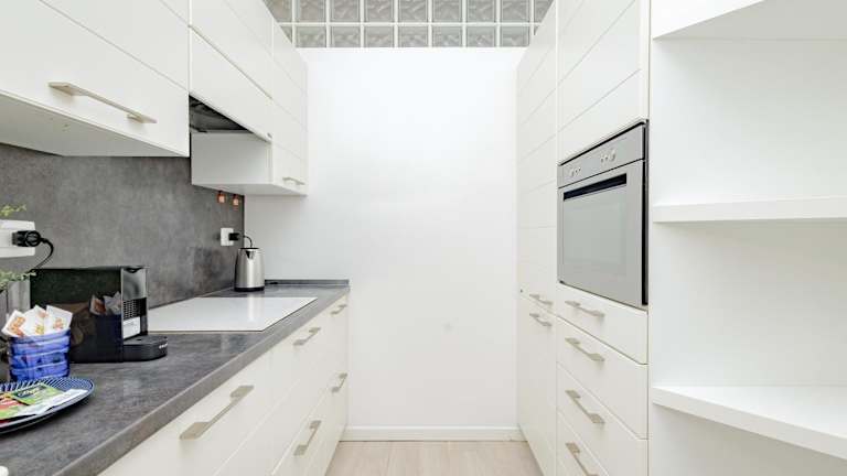 Die Ferienwohnung verfügt über eine Küche, die mit einem Kühlschrank, einem Geschirrspüler, einem Ofen, einer Kaffeemaschine und einem Wasserkocher ausgestattet ist. Keine weiteren Informationen zu Verpflegungsmöglichkeiten sind vorhanden.