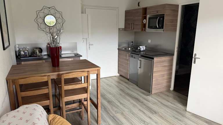 Das Apartment im 2 PIECES JARDIN, ACCES DIRECT MER ET PROCHE THALASSO verfügt über ein Schlafzimmer, eine gut ausgestattete Küche, ein Wohnzimmer und einen Flachbild-TV. Es bietet Platz und Komfort für einen erholsamen Aufenthalt.