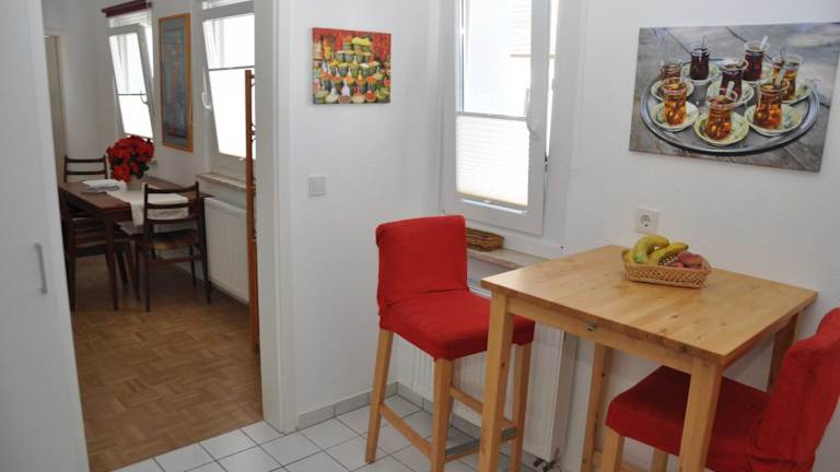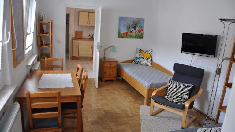 Das Apartment verfügt über ein Schlafzimmer, ein Wohnzimmer sowie eine voll ausgestattete Küche mit Kühlschrank und Kaffeemaschine. Das Badezimmer ist mit einer Dusche und einem Haartrockner ausgestattet. Handtücher und Bettwäsche werden bereitgestellt. Die Unterkunft ist rauchfrei und für Haustiere nicht gestattet.