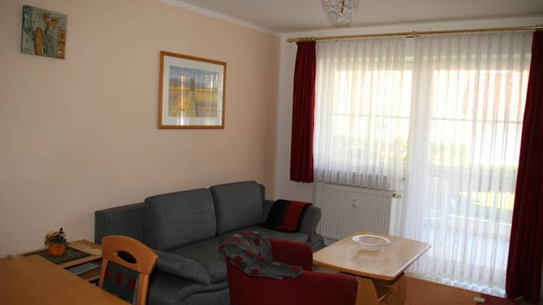 Die Ferienwohnung besteht aus einem Schlafzimmer, einem Wohnzimmer und einer voll ausgestatteten Küchenzeile, die mit einem Kühlschrank und einer Kaffeemaschine ausgestattet ist. Des Weiteren ist ein Badezimmer mit Dusche und kostenlosen Pflegeprodukten vorhanden. Handtücher und Bettwäsche werden bereitgestellt.