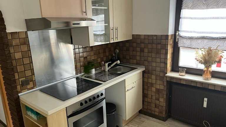 Die Wohnung verfügt über ein Schlafzimmer, ein Wohnzimmer sowie eine voll ausgestattete Küche, die mit einem Kühlschrank und einem Ofen ausgestattet ist.