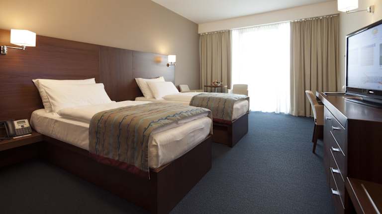 Das Hotel verfügt über 102 Zimmer. Die Zimmer sind mit Möbeln aus Nussbaum- oder Teakholz ausgestattet und mit umweltfreundlichen, wasserbasierten Pastellfarben gestrichen. Die Bodenbeläge bestehen aus antiallergenen, recycelten Materialien. Alle Zimmer, außer den Standardzimmern, beinhalten ein Wellnesspaket: Nutzung von Bademantel, Hausschuhen und Spa-Handtuch sowie unbegrenzten Zugang zu den Pools des Bohinj Wasserparks. In bestimmten Zimmern steht ein zusätzliches ausziehbares Bett (Maße 70 x 190 cm) zur Verfügung. Kostenlose Nutzung des Außenparkplatzes, Garage gegen Aufpreis. Die Zimmerausstattung umfasst: 42'' LCD-TV (106 cm) Klimaanlage Badezimmer mit Dusche oder Bad Beheizter Handtuchhalter Beleuchteter Kosmetikspiegel Safe mit Steckdose Haartrockner Telefon Doppel- oder Twin-Bett Kabel- und WLAN-Internetverbindung Fußbodenheizung im Badezimmer