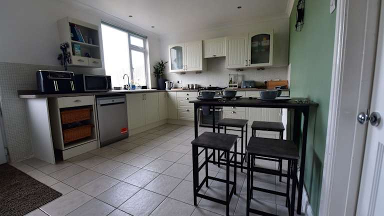 Es steht eine voll ausgestattete Küche zur Verfügung, die mit einem Kühlschrank und einem Geschirrspüler ausgestattet ist.