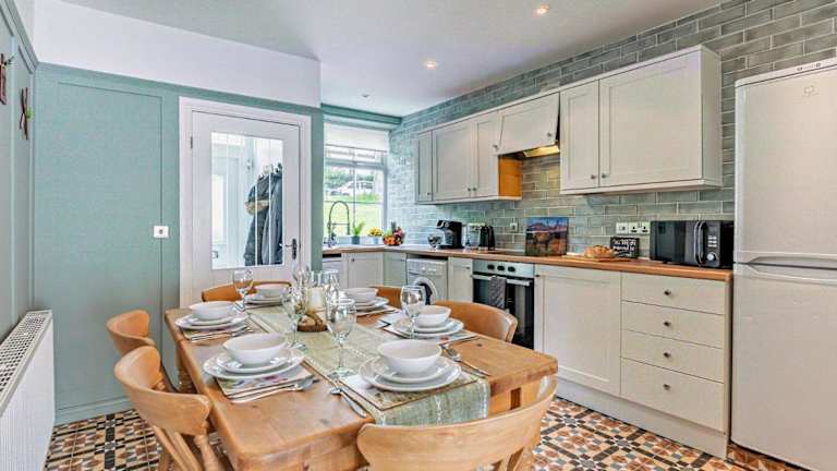 Die Unterkunft verfügt über eine voll ausgestattete Küche mit einem Kühlschrank und einem Geschirrspüler, was die Selbstverpflegung ermöglicht. Handtücher und Bettwäsche werden bereitgestellt.