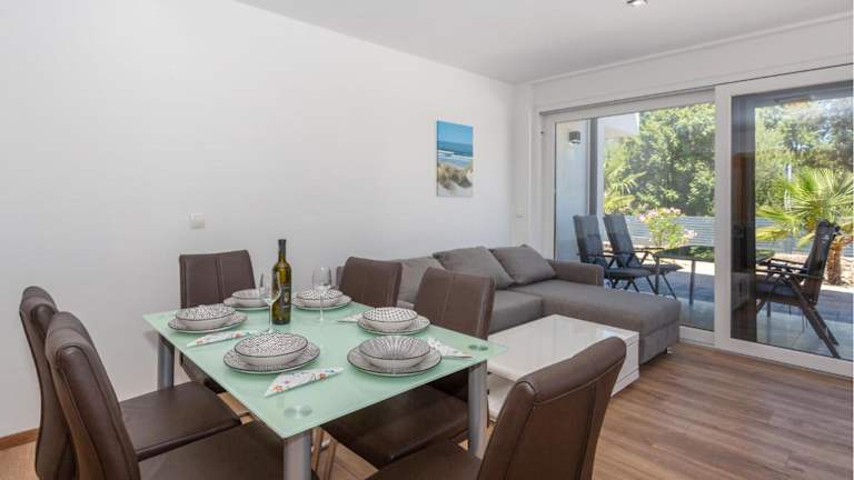Die Ferienwohnung bietet drei Schlafzimmer, ein Wohnzimmer und eine komplett ausgestattete Küche mit Kühlschrank und Geschirrspüler. Ein Fernseher ist ebenfalls vorhanden. Die Unterkunft gewährleistet Komfort durch Klimaanlage und Heizung.