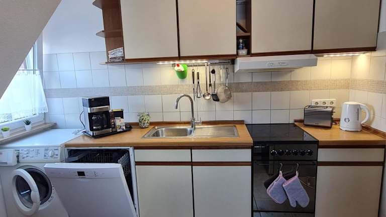 In der voll ausgestatteten Küche der Ferienwohnung können Gäste ihre eigenen Mahlzeiten zubereiten. Des Weiteren ist die Lieferung von Speisen in die Unterkunft möglich.