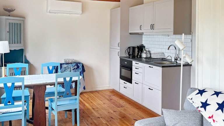 Das Ferienhaus besteht aus einem Schlafzimmer, einem Wohnzimmer, einer voll ausgestatteten Küche mit Kühlschrank und Ofen sowie einem Badezimmer. Die Unterkunft ist barrierefrei erreichbar und bietet Heizungsanlage sowie WLAN in allen Bereichen.