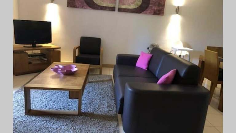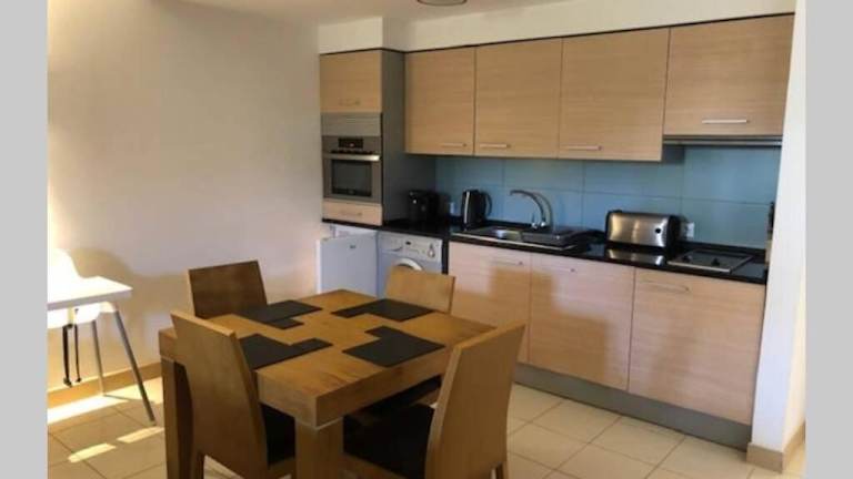 Die Ferienwohnung umfasst ein Schlafzimmer, ein Badezimmer mit Bidet und Dusche, einen Wohnbereich mit Sitz- und Essbereich sowie eine voll ausgestattete Küche mit Kühlschrank, Ofen und Mikrowelle. Handtücher und Bettwäsche werden bereitgestellt.