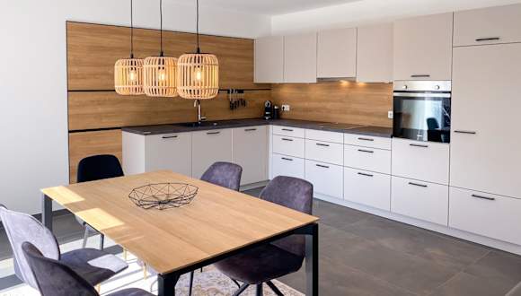 Die Ferienwohnung umfasst drei Schlafzimmer, ein Wohnzimmer, eine voll ausgestattete Küchenzeile mit Kühlschrank und Kaffeemaschine sowie zwei Badezimmer mit Dusche und Haartrockner. Handtücher und Bettwäsche werden bereitgestellt.