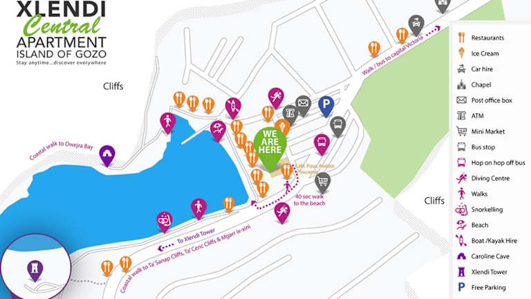 Die Unterkunft befindet sich in Xlendi, nur 200 Meter vom Strand Xlendi Beach entfernt. In der unmittelbaren Umgebung gibt es Möglichkeiten zum Wandern, Schnorcheln sowie Fahrradfahren. Cittadella ist 3,7 km und die Basilika ta’ Pinu 6,5 km entfernt. Der nächstgelegene Flughafen ist der Flughafen Malta, welcher 41 km weit entfernt ist.