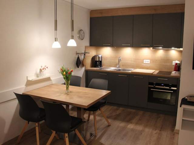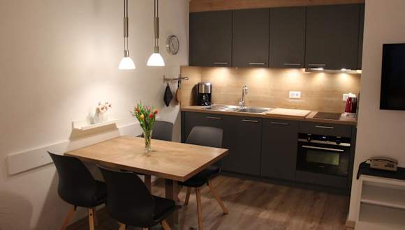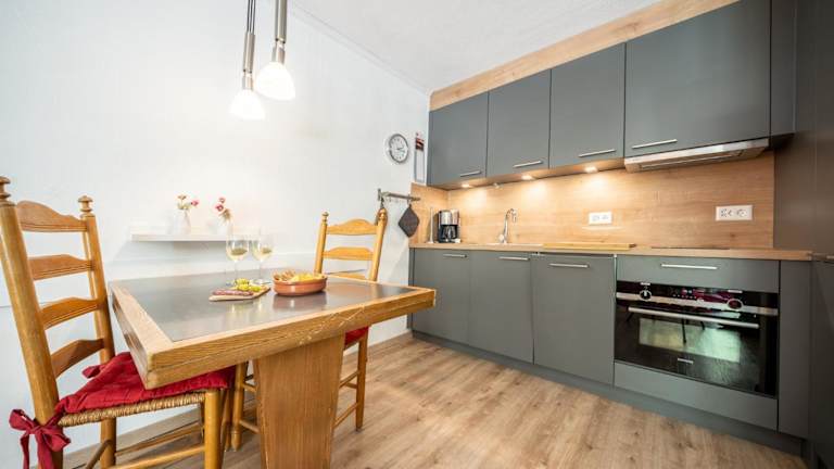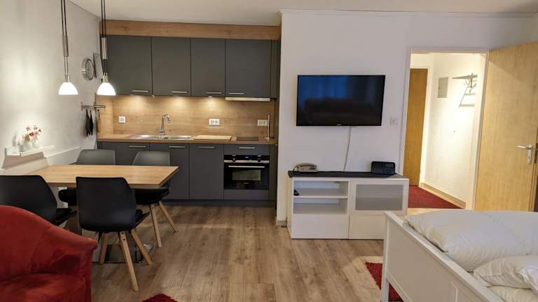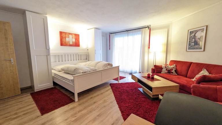 Die Zimmer sind als stilvoll eingerichtete Studios konzipiert und verfügen über eine Küche, die mit Kühlschrank, Geschirrspüler, Ofen, Toaster, Kaffeemaschine und Wasserkocher ausgestattet ist. Jedes Studio bietet zudem ein eigenes Badezimmer mit Badewanne sowie eine Terrasse mit Bergblick.