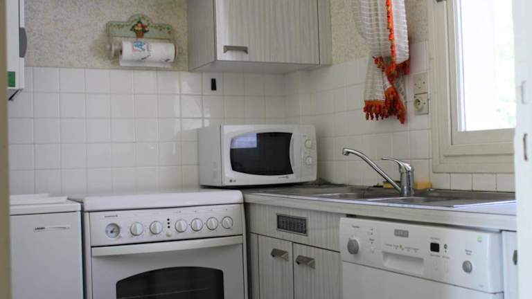 Die Küchenzeile ist mit einem Kühlschrank, einem Ofen, einer Mikrowelle sowie einer Kaffeemaschine ausgestattet, jedoch sind keine Informationen zu weiteren Verpflegungsmöglichkeiten oder Essensangeboten vorhanden.