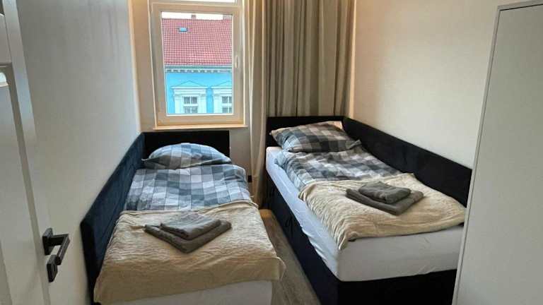 Die Ferienwohnung umfasst 2 Schlafzimmer, ein Wohnzimmer und eine voll ausgestattete Küche, die mit einem Kühlschrank und einem Wasserkocher ausgestattet ist. Darüber hinaus stehen ein Badezimmer mit Dusche und Haartrockner zur Verfügung. Handtücher und Bettwäsche sind ebenfalls vorhanden.