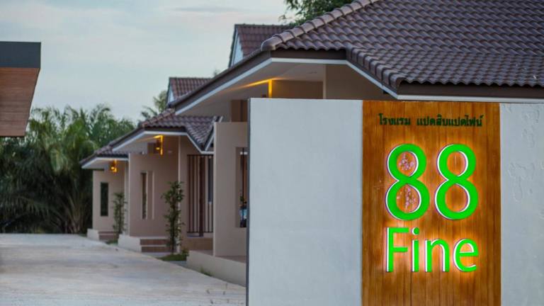 88 Fine Hotel @ Suratthani Airport ist ein Gasthaus mit Übernachtungsmöglichkeiten, das über einen Garten, kostenlosen Privatparkplatz, eine Gemeinschaftslounge und eine Terrasse verfügt. Die Unterkunft bietet klimatisierte Zimmer mit kostenlosem WLAN und eigenem Badezimmer. Es gibt auch eine Gemeinschaftsküche und Zimmerservice. Die Rezeption ist rund um die Uhr besetzt und die Mitarbeitenden sprechen Englisch und Thailändisch.