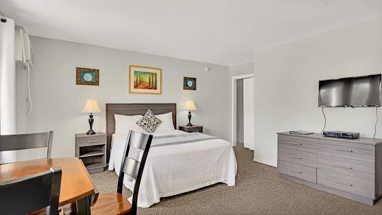 Die Zimmer im A Wave Inn – Montauk verfügen über Kabel-TV, Internetzugang (LAN), eine Mikrowelle sowie einen Kühlschrank. Die Einrichtung umfasst Holzmöbel und Teppichboden, was zu einem komfortablen Aufenthalt beiträgt.