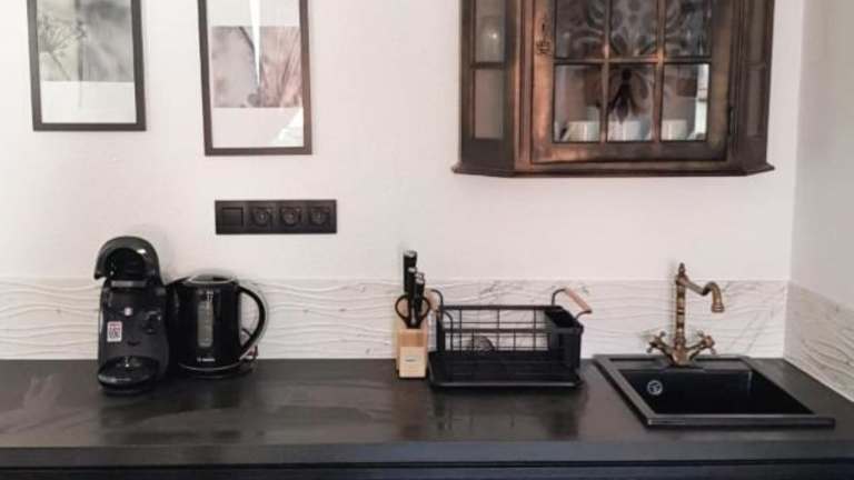 Die Ferienwohnung verfügt über eine voll ausgestattete Küchenzeile, die unter anderem einen Kühlschrank und eine Kaffeemaschine beinhaltet. Es sind keine weiteren Verpflegungsmöglichkeiten angegeben.