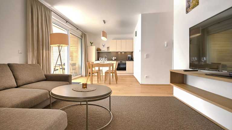 Die Ferienwohnung verfügt über ein Schlafzimmer, ein Wohnzimmer, einen TV sowie eine gut ausgestattete Küche mit Kühlschrank und Geschirrspüler. Das Badezimmer ist mit einer Dusche ausgestattet.
