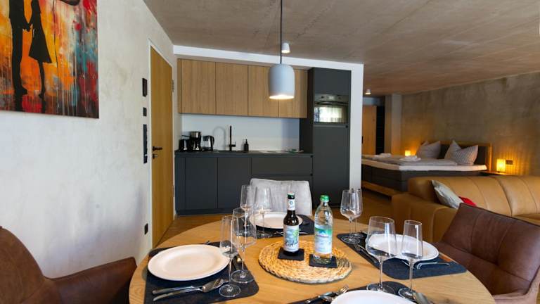 Die Ferienwohnung beinhaltet eine Küchenzeile, die mit einem Kühlschrank, einem Geschirrspüler, einem Ofen, einer Kaffeemaschine sowie einem Wasserkocher ausgestattet ist. Des Weiteren verfügt die Wohnung über einen Kabel Flachbild-TV und ein Wohnzimmer.