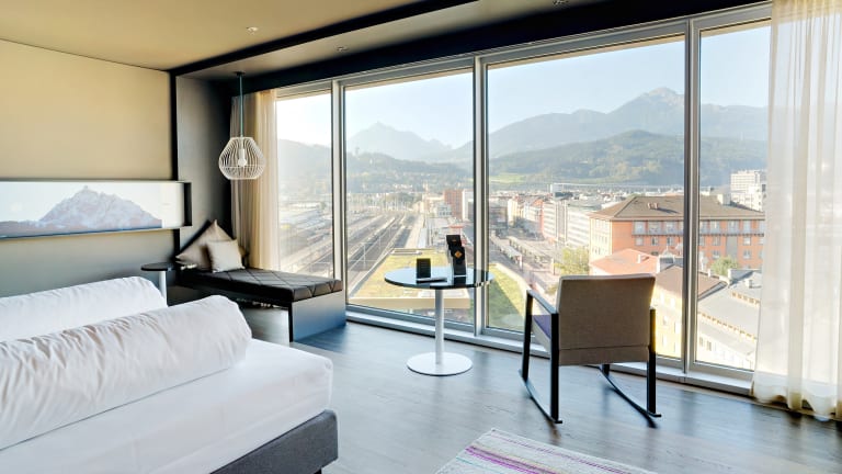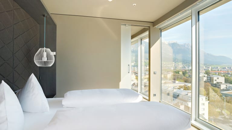 Alle Zimmer im Hotel sind in urban-alpinen Design-Stil eingerichtet und bieten allesamt einen einzigartigen Ausblick auf die Stadt und die umliegende Bergwelt. Hochwertige Tiroler Materialien wie Loden, Teppiche, Granit bestimmen das Design.