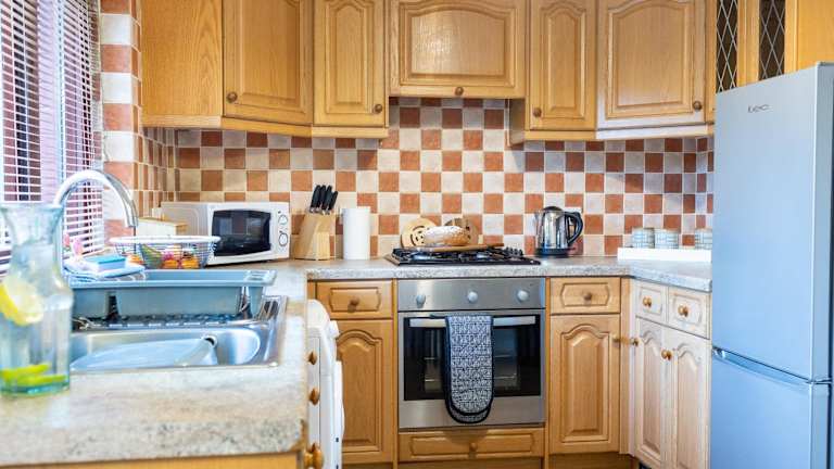 Die Ferienwohnung verfügt über zwei Schlafzimmer, ein Wohnzimmer sowie eine voll ausgestattete Küche mit Kühlschrank und Essbereich. Weiterhin steht ein Badezimmer und ein Flachbild-TV zur Verfügung.