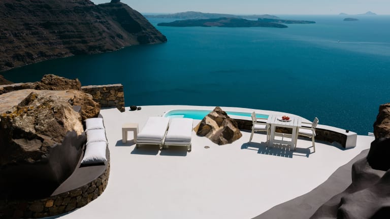 Das Aenaon Villas liegt am Rand der weltberühmten Caldera auf Santorin. Die Lage am höchsten und schmalsten Teil der Insel ermöglicht einen spektakulären Blick auf die Ägäis, die Caldera, den Vulkan und den Sonnenuntergang. Die Villen sind in einem traditionellen Stil erbaut und fügen sich harmonisch in die kykladische Architektur ein. Die Umgebung bietet viele Möglichkeiten für Erkundungstouren und Aktivitäten, darunter Wanderungen entlang der Caldera, Besuche der nahe gelegenen Dörfer und Erkundung der Strände von Santorin.