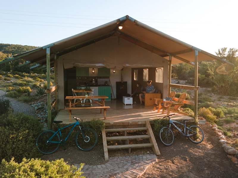 Das AfriCamps Klein Karoo bietet eine luxuriöse und einzigartige Unterkunftserfahrung auf einer Straußenfarm in der Nähe von Oudtshoorn. Die geräumigen und gut ausgestatteten Luxus-Zelte bieten Ihnen eine traumhafte Umgebung mit einer eigenen Holzterrasse und Blick auf die atemberaubende Natur und das Landgut. Genießen Sie den offenen Wohnbereich, die voll ausgestattete Küche und den Essbereich. Die klimatisierten Zelte verfügen über gemütliche Kamine und private Badezimmer mit Warmwasserduschen. Starten Sie Ihren Tag mit einem optionalen Frühstück, das in einem Korb direkt in Ihr Zelt geliefert wird.