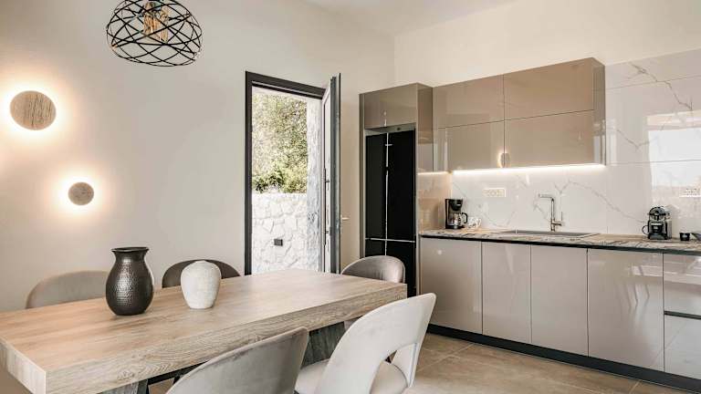 Es gibt eine voll ausgestattete Küche mit Kühlschrank, Geschirrspüler, Ofen, Mikrowelle, Herdplatte, Kaffeemaschine sowie Wasserkocher. Grillmöglichkeiten sind ebenfalls vorhanden.